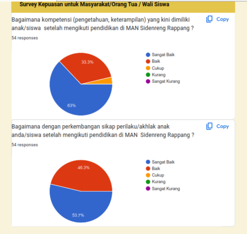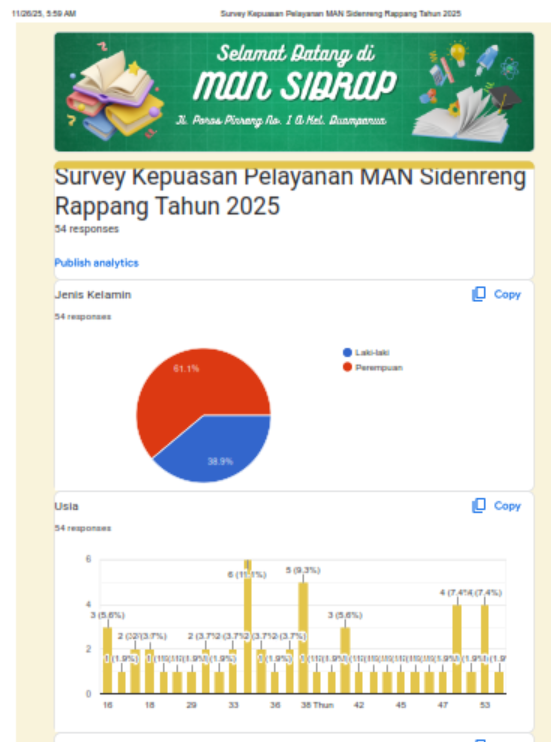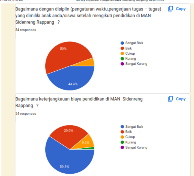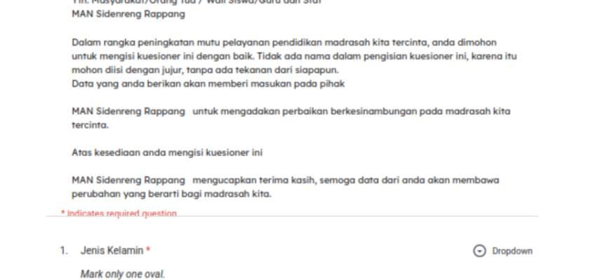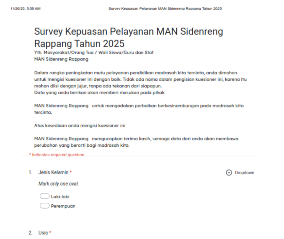 Survei Kepuasan Masyarakat (SKM) merupakan instrumen penting dalam rangka mengukur tingkat kepuasan masyarakat terhadap layanan yang diberikan oleh satuan kerja pemerintah, termasuk satuan pendidikan madrasah. MAN Sidenreng Rappang sebagai lembaga pendidikan di bawah Kementerian Agama memiliki kewajiban untuk memberikan pelayanan pendidikan yang bermutu, transparan, dan akuntabel kepada masyarakat.