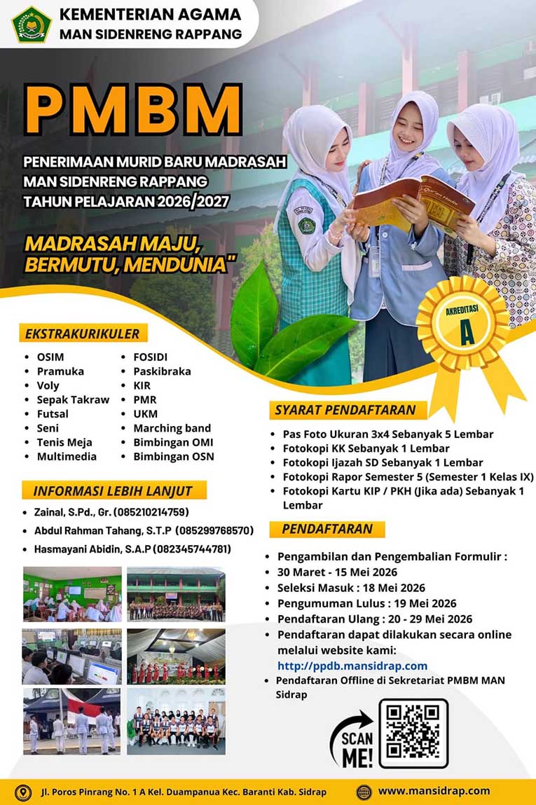 MAN Sidenreng Rappang membuka Penerimaan Murid Baru Tahun Pelajaran 2026/2027 bagi lulusan MTs/SMP yang ingin melanjutkan pendidikan di MAN Sidenreng Rappang dengan perpaduan prestasi akademik, penguatan karakter, dan nilai-nilai keislaman. Didukung tenaga pendidik profesional, fasilitas pembelajaran yang memadai, serta berbagai kegiatan ekstrakurikuler seperti Pramuka, PMR, UKM, Marchingband, Paskibraka, Multimedia, Fosidi, KIR, olahraga, dan seni, MAN Sidenreng Rappang berkomitmen mencetak generasi yang cerdas, berakhlak mulia, dan siap bersaing di era global. Ayo bergabung dan raih masa depan gemilang bersama MAN Sidenreng Rappang Tahun Pelajaran 2026/2027